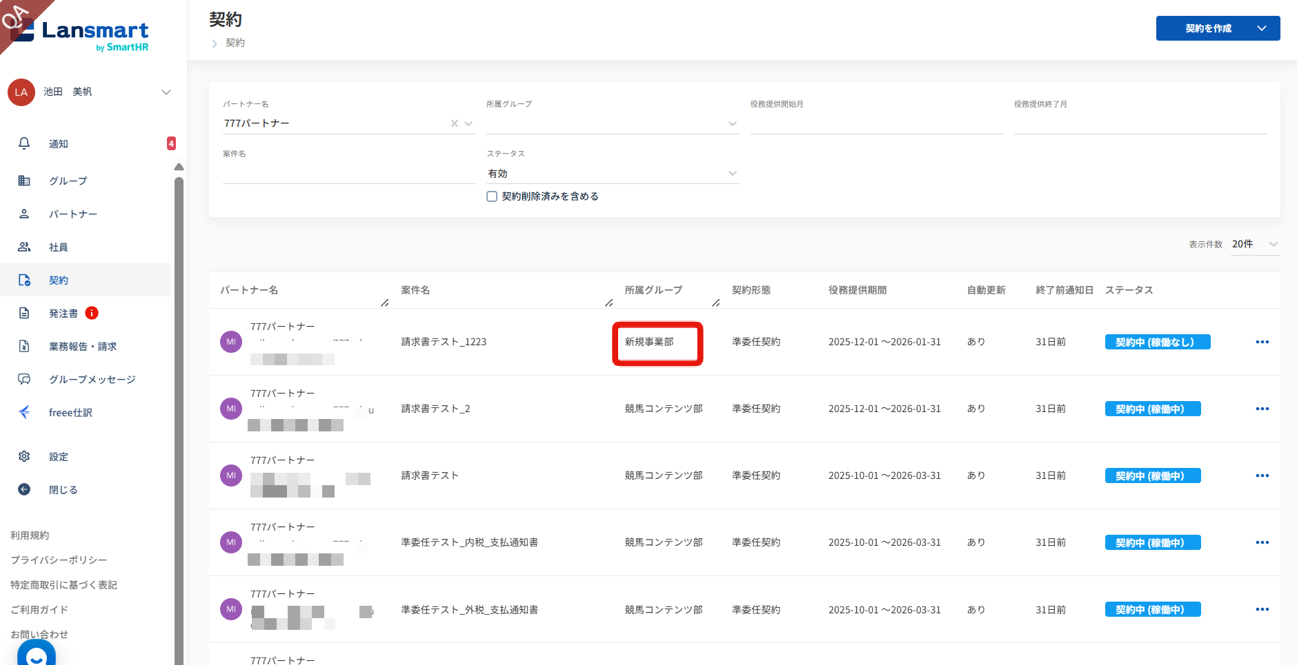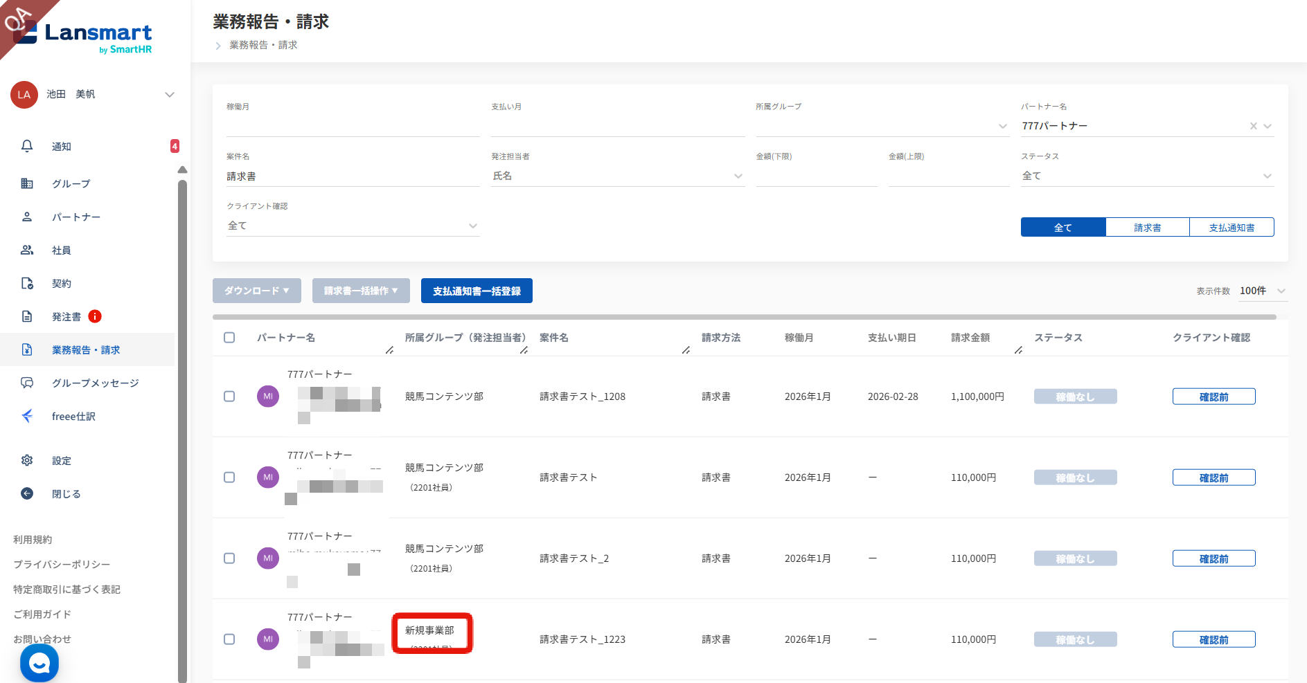 企業オーナーにて作成された支払調書について、グループオーナーとして所属しているグループのパートナーの支払調書が閲覧できます。