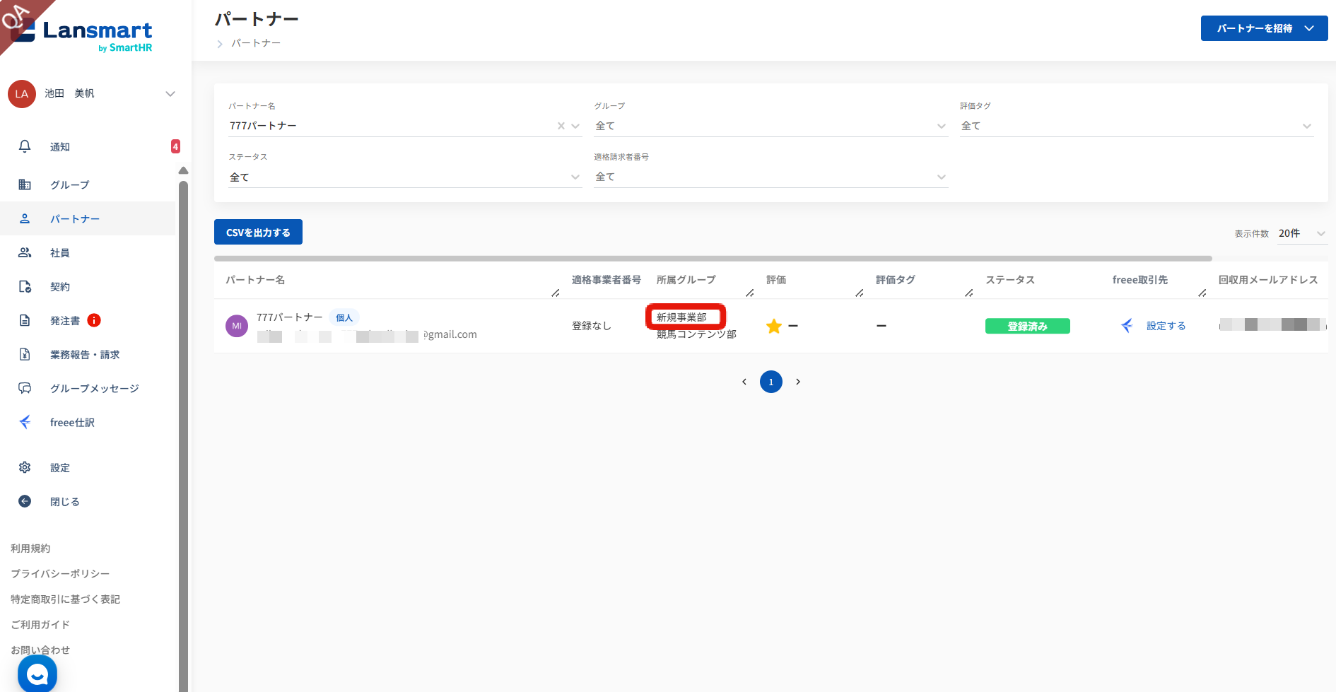 グループ一覧の該当グループをクリックすると表示されるユーザー一覧に該当パートナーが追加されます。