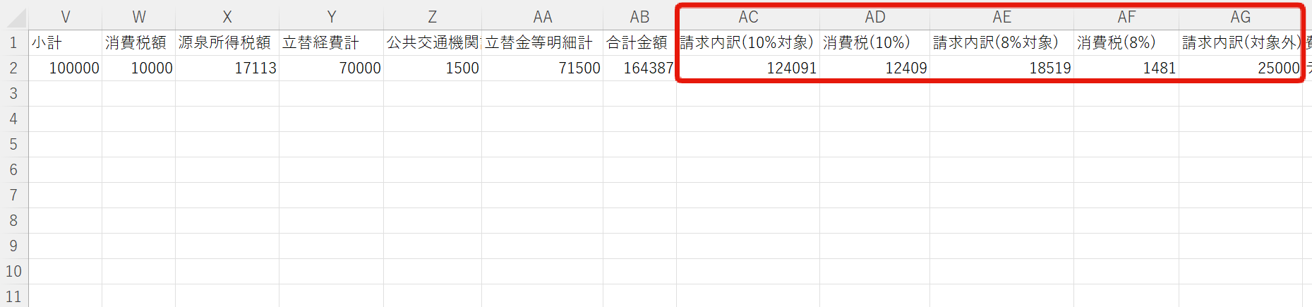 CSVの「合計金額」と「費目1」の間に以下の5項目が追加されました。