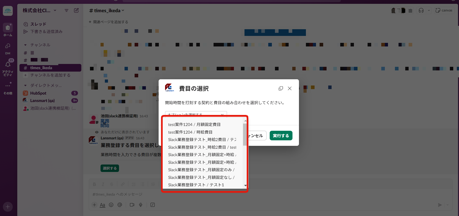 同月内に業務登録が可能な費目が複数ある場合は、業務開始の打刻後、Lansmart by SmartHR botより「業務登録する費目を選択してください。」という返信がありますので、「選択する」から費目を選択し、「実行する」ボタンを押してください。