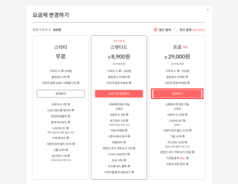 요금제 종류를 업그레이드하면서 '구독자 수 구간'을 선택할 수 있습니다. 이후 결제 갱신일에는 워크스페이스에 등록된 전체 구독자 수를 기준으로 자동 결제됩니다.