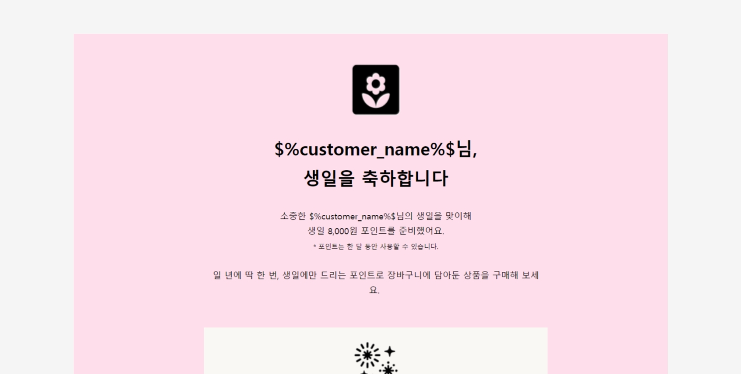 생일, 회원가입 1주년 등 여러 기념일을 축하해주고 싶거나 기념일과 관련한 여러 혜택을 안내하고 싶을 때, 기념일 축하 이메일을 보낼 수 있습니다.