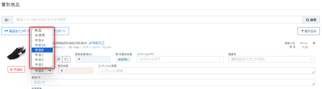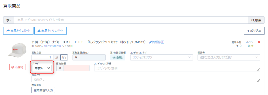上記設定により、店頭買取では『未使用』(中古タイプの最上位)が標準で表示されます。