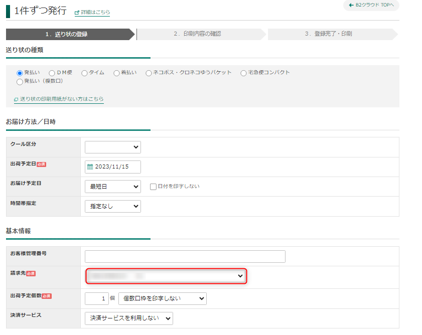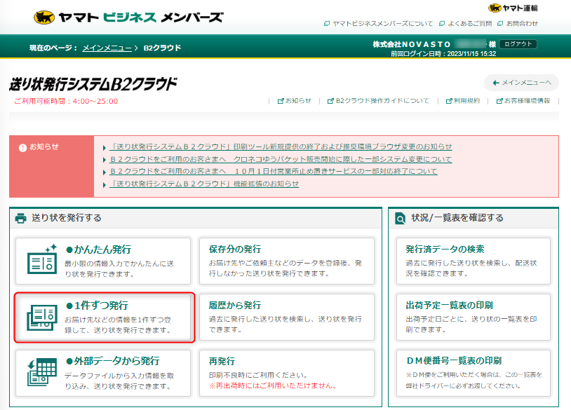 B2クラウド画面の「送り状を発行する」項より【1件ずつ発行】をクリックする。