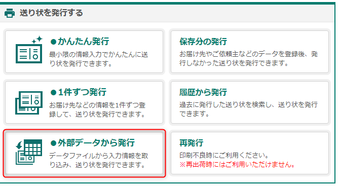 B2クラウド画面の「送り状を発行する」項より【外部データから発行】をクリックする。