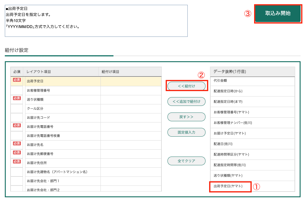 「紐付け設定」項の右側【データ抜粋(1行目)】欄より、紐付ける項目を適宜選択し、中央の【<<紐付け】ボタンをクリックし追加、全て紐づけ完了後、【取込み開始】をクリックする。