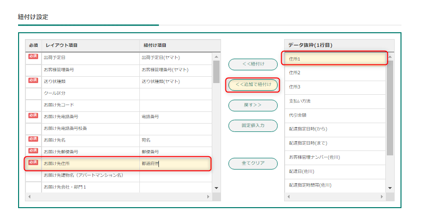 1つのレイアウト項目に対して、RECOREのCSVより複数の項目を紐づけする際は、以下の画像のように、【<<追加で紐付け】をクリックして設定を行います。
