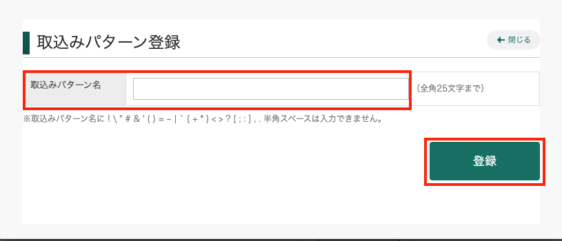 表示された画面の「取込みパターン名」より任意の名称を入力のうえ、「登録」をクリックする