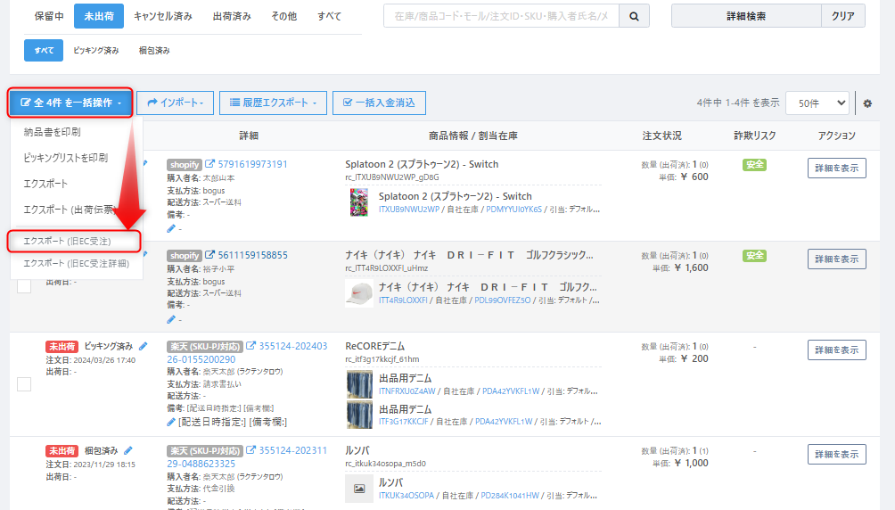 【選択中の〇件を一括操作】より【エクスポート(旧EC受注)】をクリックする