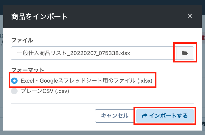 仕入商品インポートは、一度に1,000件までかつデータ容量10MB未満です。