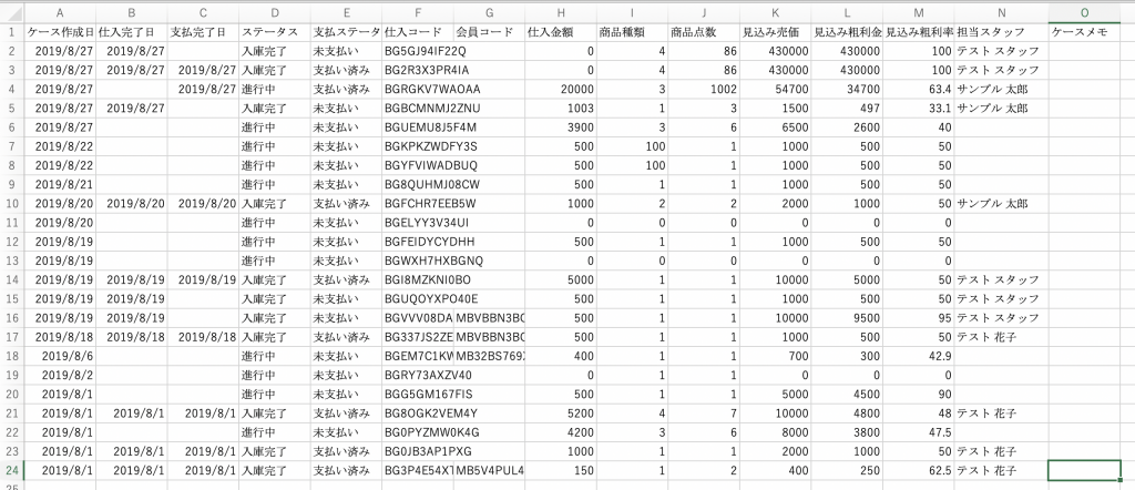 【ケースリスト】画面では、最新の仕入ケースが一番上に表示されています。