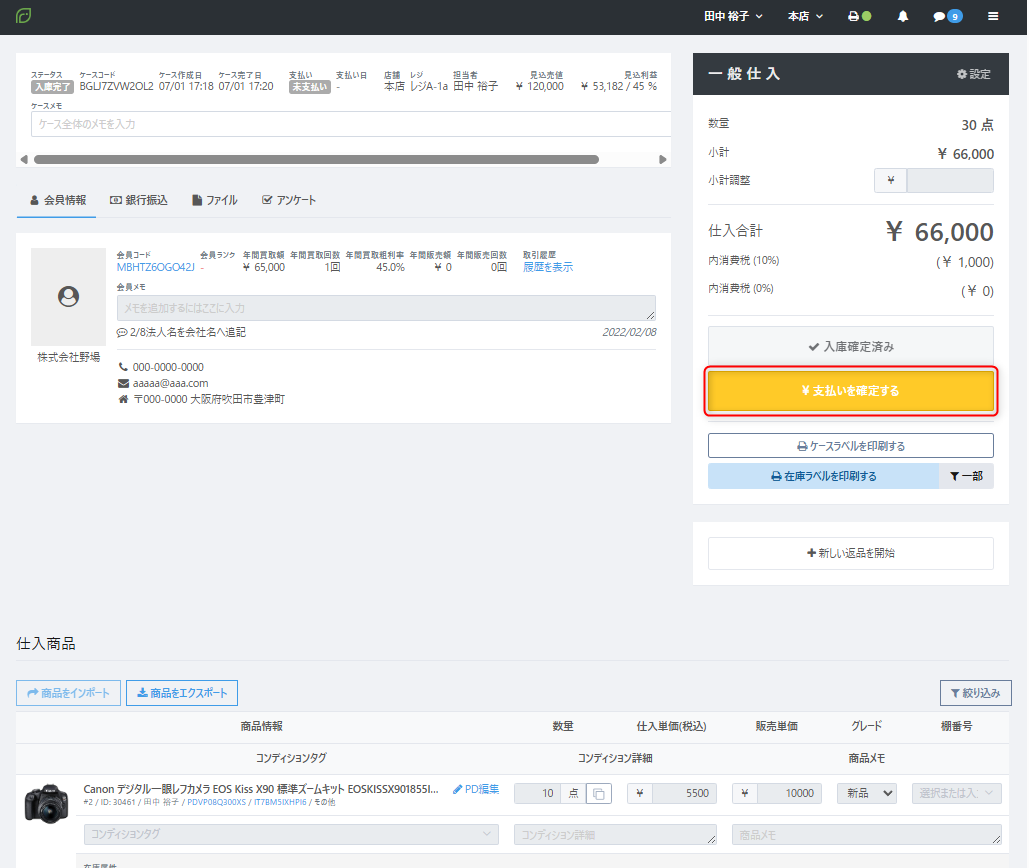 ※詳細は「■入庫と同時に支払いを行う場合」の「➁支払い方法・支払い日を指定して確定」を参照ください。