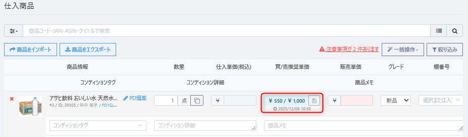 売買価格ルール設定のある商品は、仕入商品に入力後の【買/売推奨単価】の下に登録の最新日時が表示されます。