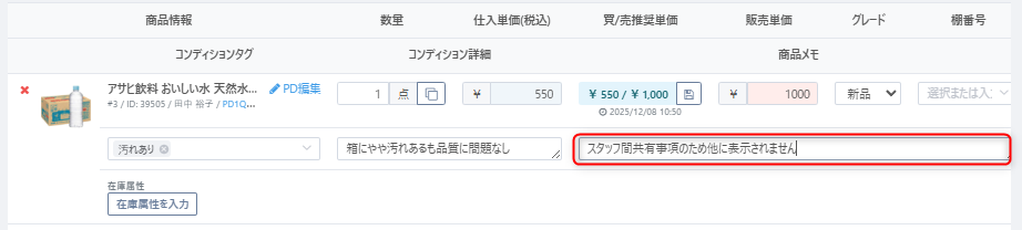 商品メモ:スタッフ間の共有情報を自由に記載することが可能です。