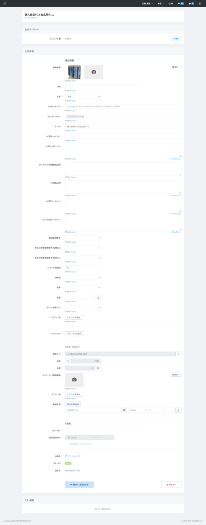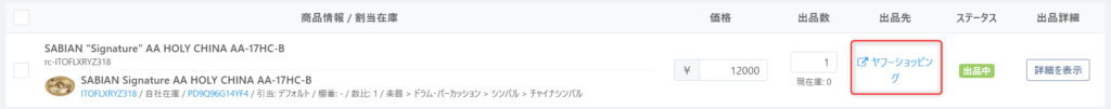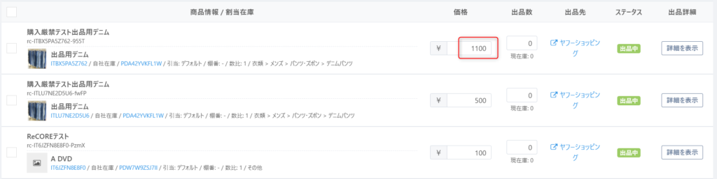 ※出品情報を修正更新の処理を行う際、ステータスは『出品中』のまま変わりません。
