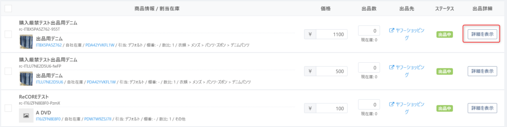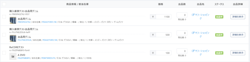 出品操作の完了を確認する場合は【出品リスト】画面にて当該商品の出品情報「出品先」項のストア名をクリックします。 ReCOREから出品したヤフーショッピング出品商品のページが表示されます。