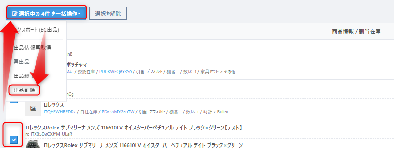 RECOREの【EC>出品リスト】より削除したい商品にチェックをいれ、【選択中の〇件を一括操作】より【出品削除】をクリックします。