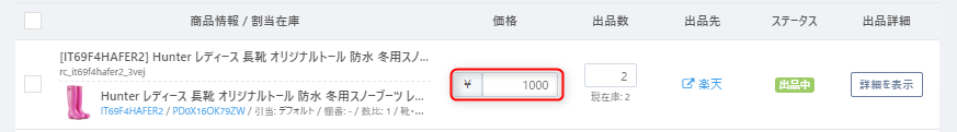 ReCOREから楽天へ出品操作後、出品中の出品情報を更新することが可能です。