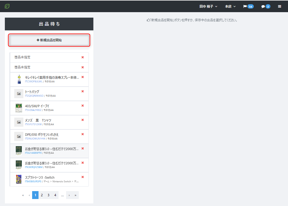 【EC】メニューより【出品待ち】画面を開き、【+新規出品を開始】ボタンをクリックする