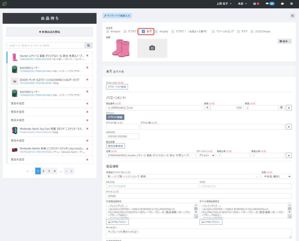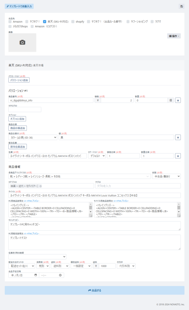 例)あらかじめ作成された出品先「楽天」出品テンプレート