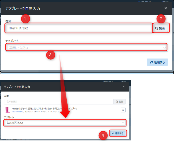 【テンプレートで自動入力】画面より出品したい在庫、出品時に利用したいEC出品テンプレートがある場合は、各項目を指定のうえ、【適用する】をクリックする