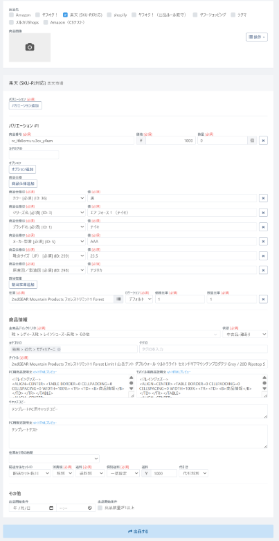 価格比率[必須] | 基本的に『1』が表示される ※新規出品後に在庫の価格を変更した場合、その変更した【販売価格】に対して入力した比率で出品中販売価格に反映される。 例)出品時の在庫販売金額が1,000円で【価格比率:1.5】で新規出品し、その後在庫価格を2,000円に変更した場合 出品中の販売価格は「3,000円」になる。 ※EC同期設定の【価格同期:する】を設定している場合に限る |
