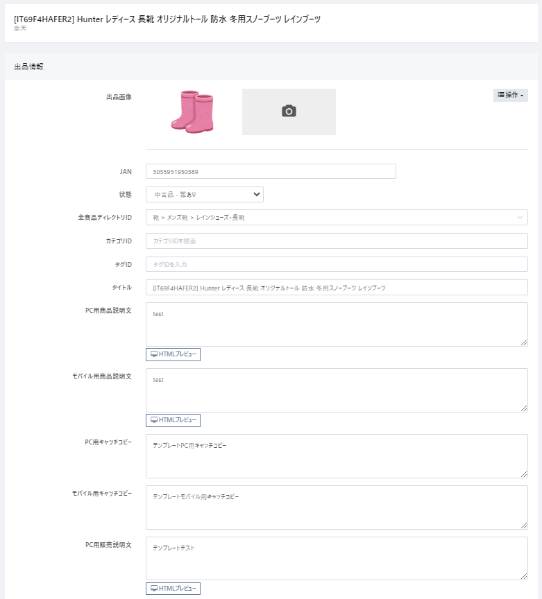 以下画像のようにテンプレート内容が反映された状態で各出品項目が表示されます。