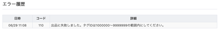 出品情報の更新ができなかった場合は、「エラー履歴」に処理できなかった情報が表示される。