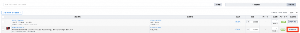 「EC>出品リスト」画面より当該出品情報の「出品詳細」欄の【詳細を表示】をクリックする