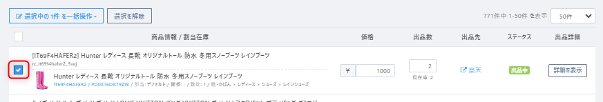 ※各ECモールにて当該在庫が出品されている状態の場合のみ、出品情報を更新できます。 ※前回の出品操作時の「商品番号」を変更することはできません。 ※出品情報を修正更新の処理を行う際、ステータスは『出品中』のまま変わりません。