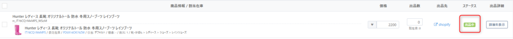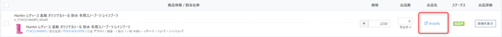 出品操作の完了を確認する場合は【出品リスト】画面にて当該商品の出品情報「出品先」項のストア名をクリックします。 ReCOREから出品したShopify出品商品のページが表示されます。