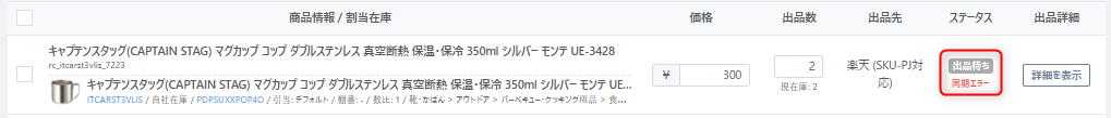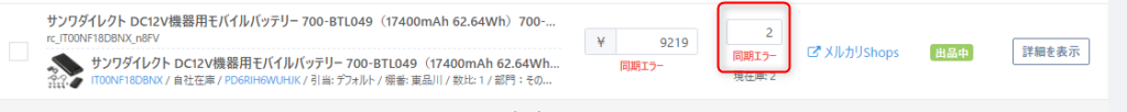 RECOREの【出品リスト】画面の出品ステータスが『出品中』にもかかわらず、【価格】や【出品数】に『同期エラー』が表示され、以下のいずれかに該当する場合: