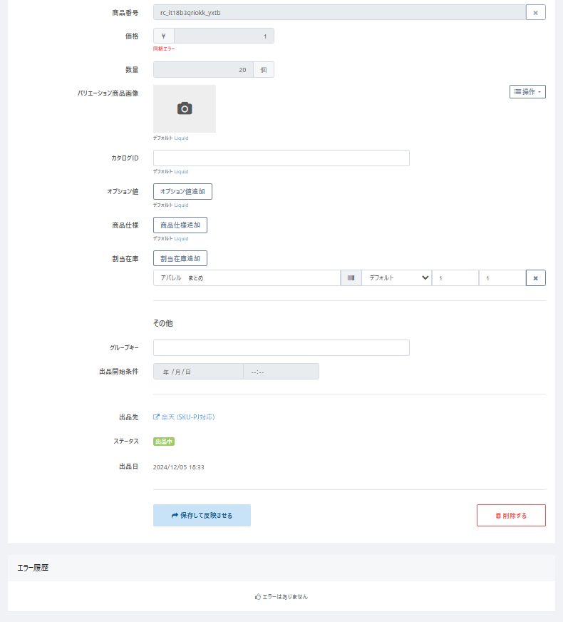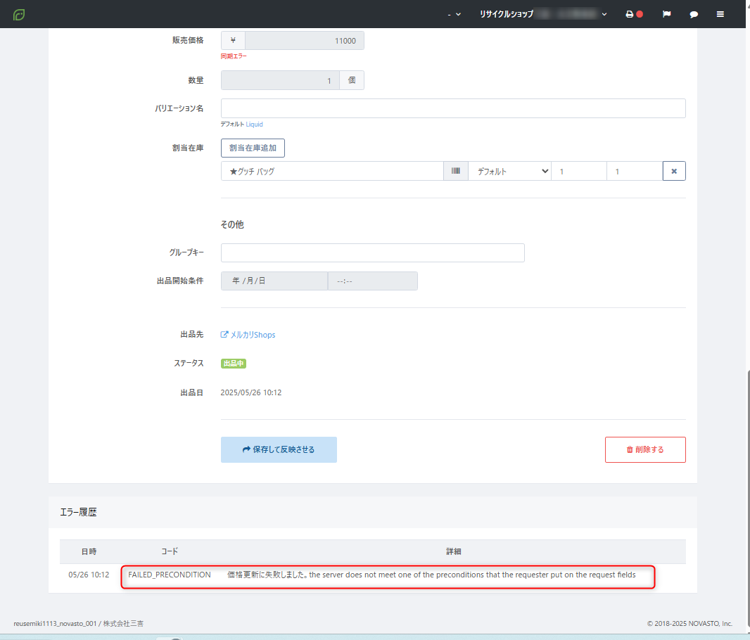 出品詳細画面のエラー履歴を確認・対応後も解消されない