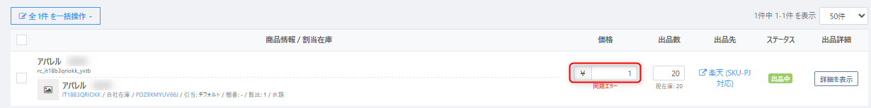 2 | 価格更新に失敗しました。バリアントが見つかりません | 該当出品のSKUこちらの出品情報は、Shopify側の管理画面に出品データが存在していない可能性があります。 Shopify管理画面より同出品の「SKU」で検索のうえ、データが存在しているかどうか確認ください。存在していない場合は、改めて【出品待ち】より出品操作を行ってください。 | |