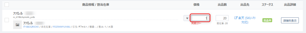 ▼【出品リスト】画面の出品ステータス『出品中』かつ『価格』に『同期エラー』イメージ