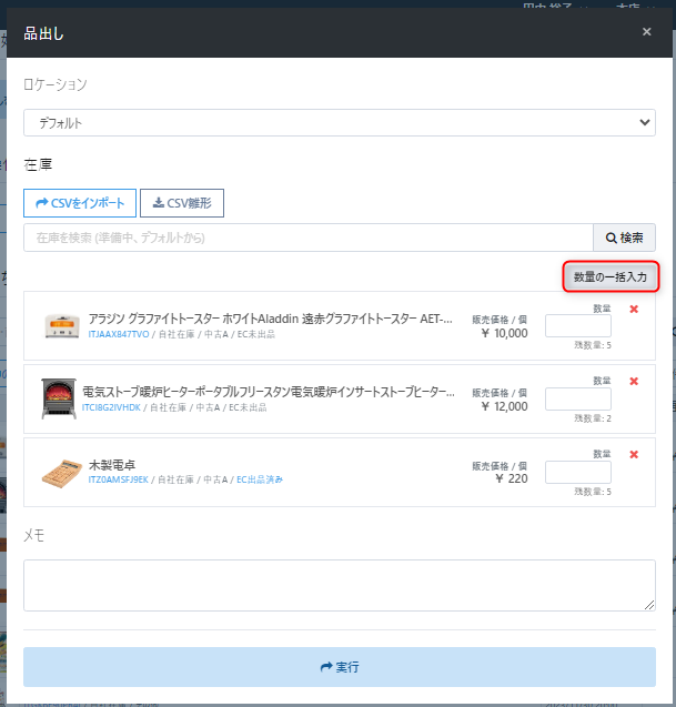 各在庫の【数量】を入力のうえ、【実行】ボタンをクリックすることで品出し完了です。