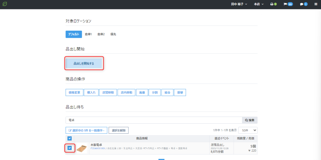 該当する在庫のボックスをクリックのうえ、【品出しを開始する】ボタンを押すと、選択した在庫が表示されます。
