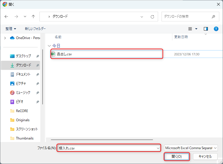 先ほど作成した品出しデータを指定のうえ、【開く】をクリックすることで、CSVデータの内容が反映されます。