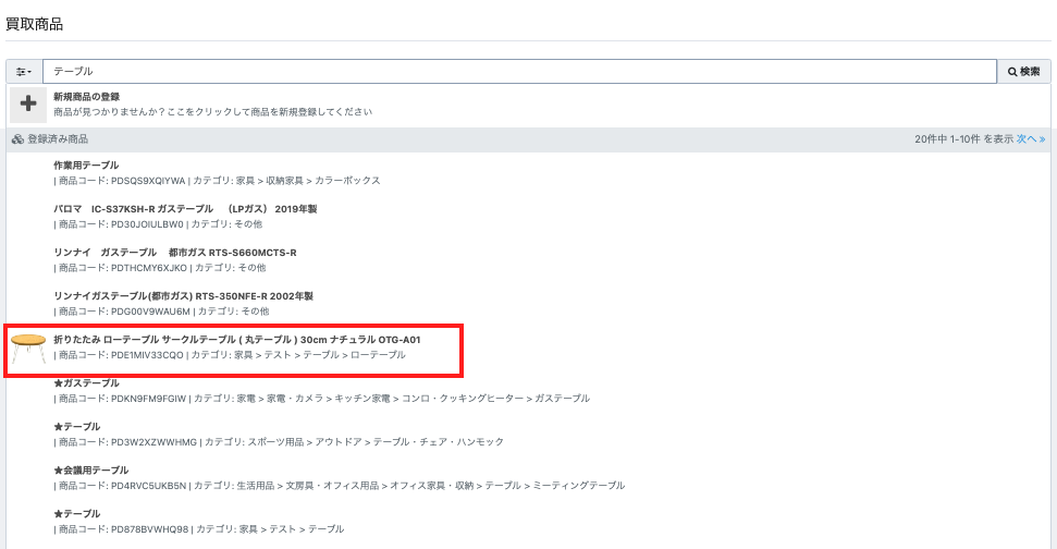 登録をすることで、買取(仕入)時の買取商品の検索では、登録されたカタログ名のキーワード、またはカタログコードを入力すると、候補が表示されます。