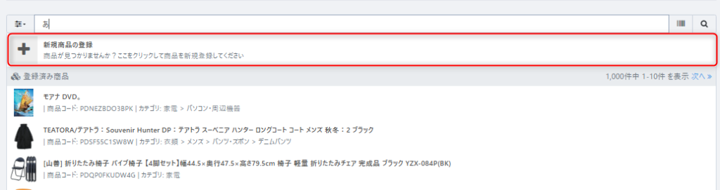 商品登録欄で商品名を検索した後に表示される【新規商品の登録】をクリック