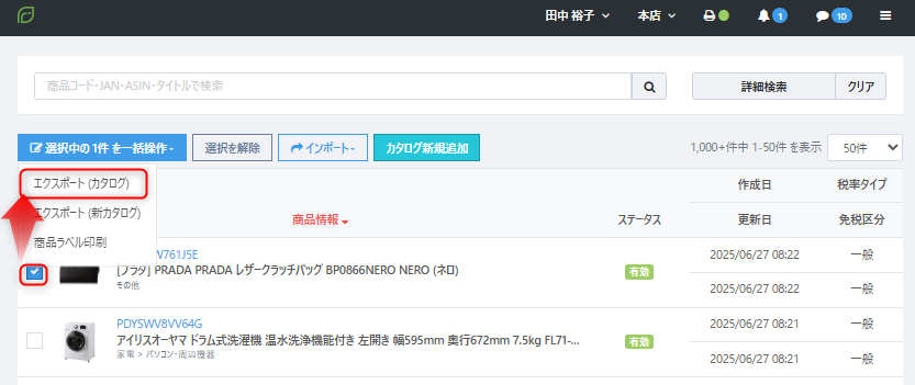 更新したいカタログを表示後に左側にチェックのうえ、【全○件を一括操作】より【エクスポート(カタログ)】をクリック