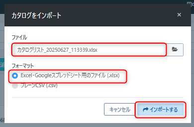 【インポート】より【カタログ】をクリック後に変更したExcelデータファイルを指定します。