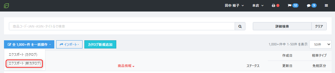 更新したいカタログを表示後に左側にチェックを入れ、【全○件を一括操作】より【エクスポート(新カタログ)】をクリック