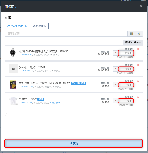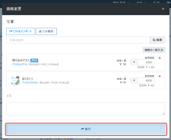 変更後の金額を【販売価格】に入力後、【実行】クリックすることで価格が変更されます。