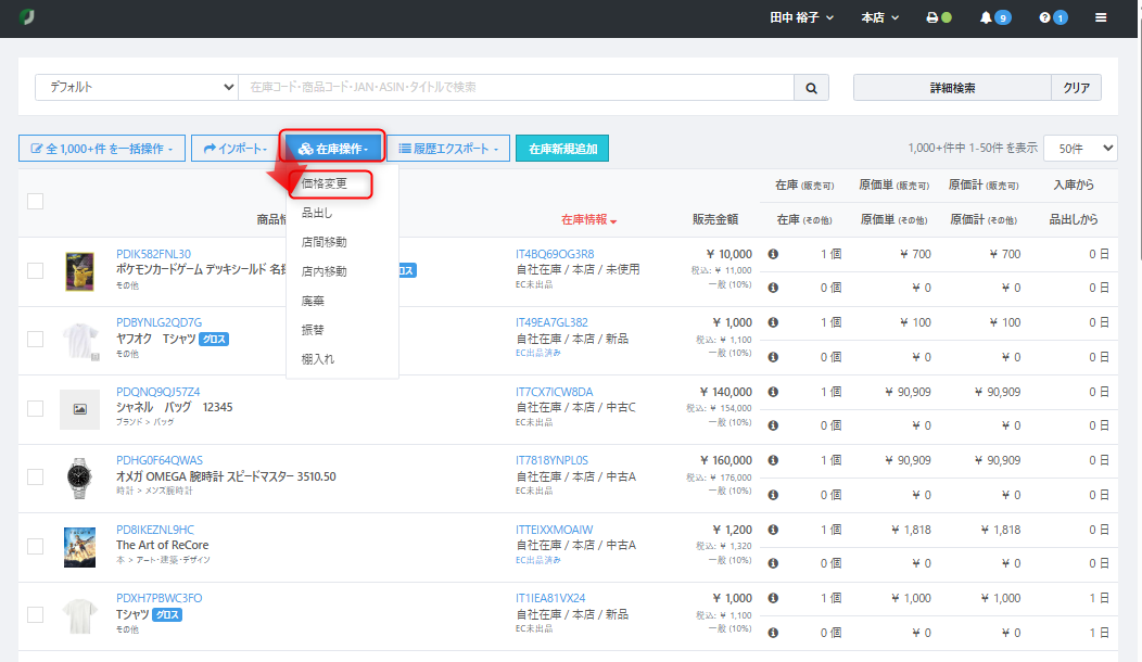 【在庫操作】ボタンをクリックし【価格変更】を選択