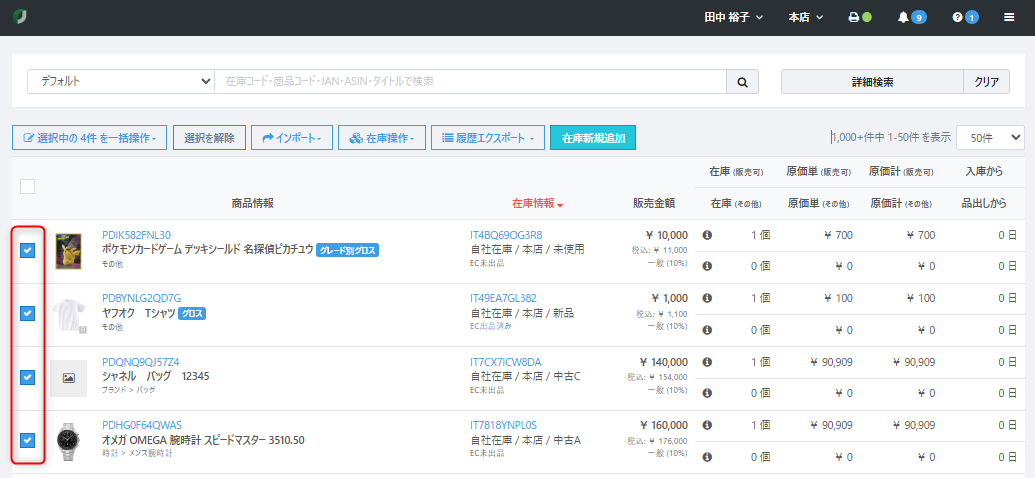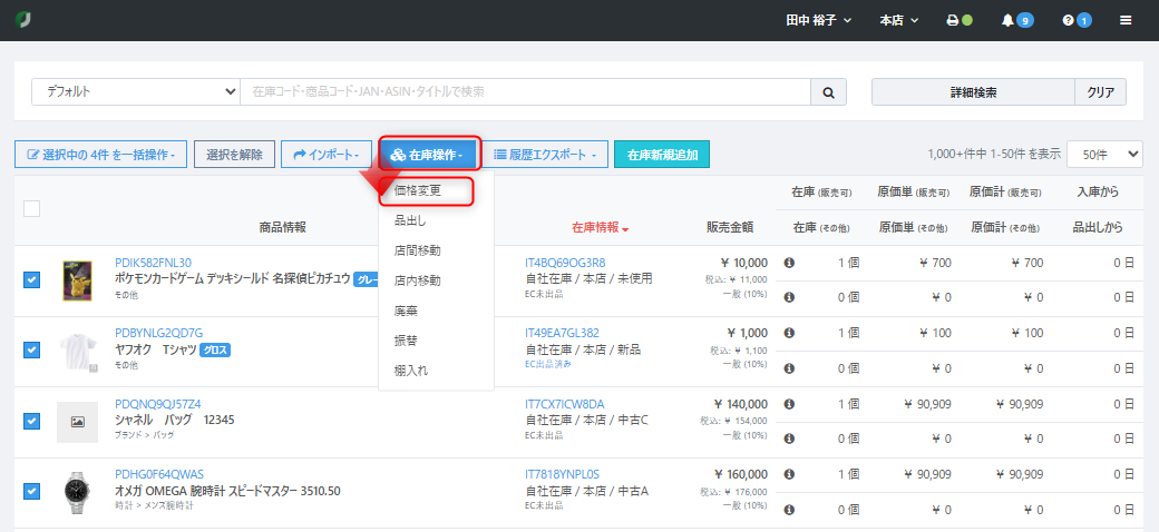 在庫の保管場所である店舗や全店舗から操作が可能です。