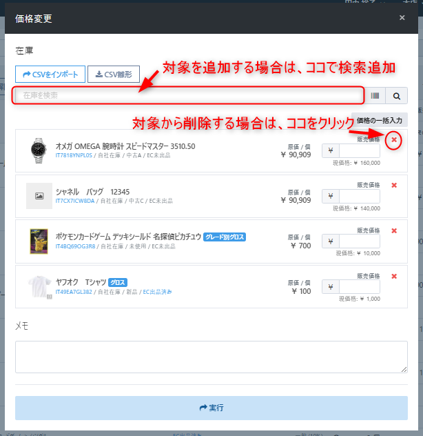 なお、表示された【価格変更】画面より対象在庫の追加・削除も可能です。
