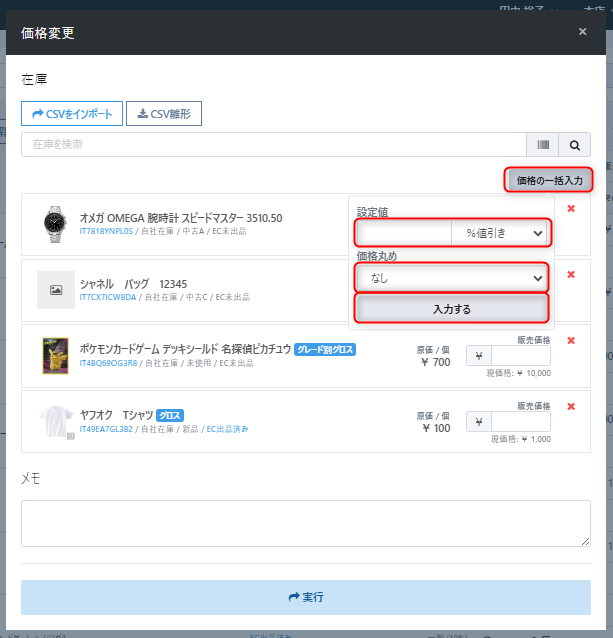 複数の在庫におけるの販売金額を一括で変更することが可能です。