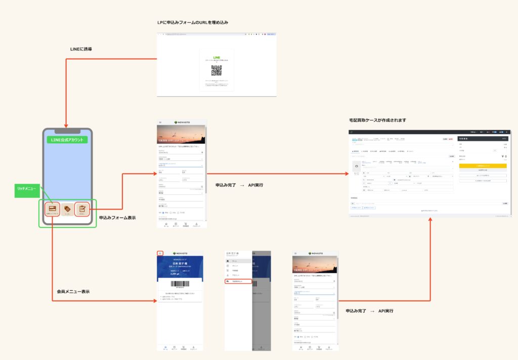 宅配買取申込みフォームを作成していただきます。 作成した宅配買取申込みフォームをLINEミニアプリに埋め込むことで、 ReCORE会員情報の取得とフォーム上への表示、フォームへ入力した内容をReCOREに連携を行うことができます。