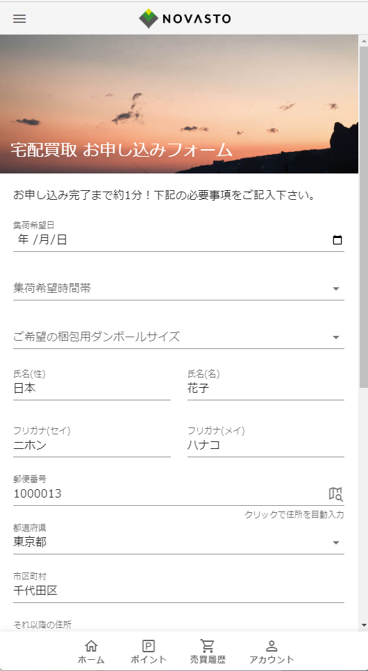 フォーム作成を内製で行う場合は、サンプルの宅配買取フォームをご提供いたします。 参考いただき貴社側での構築対応をお願いします。